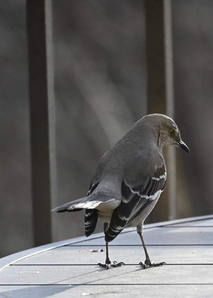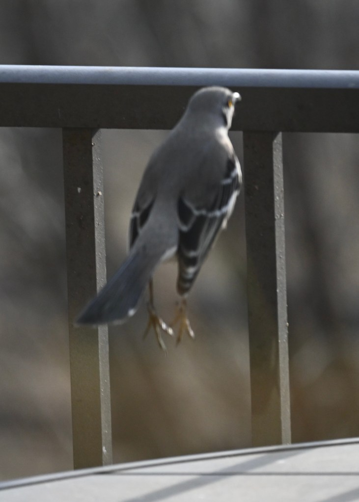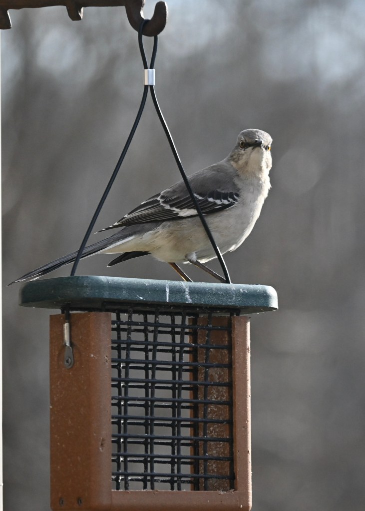 Exhaustion prohibits a long blog post, but the day warmed up and we had a nice afternoon, with laughter, which is very therapeutic. The mockingbird has been staying around, and I got an almost great picture of it. I love the sword of a tail and the expressive, yellowish brown eyes.