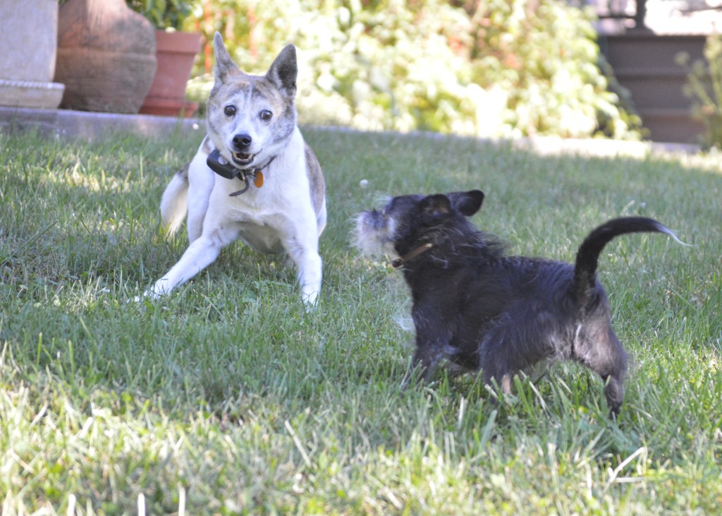 Roscoe and Rosie were enjoying the sunshine, and I got a picture of them with my phone, but it was not good enough to post. I looked up an old picture I took of them in the shed – eight years ago, already! It is one of my favorite pictures of those siblings, who are 14 years old this year!