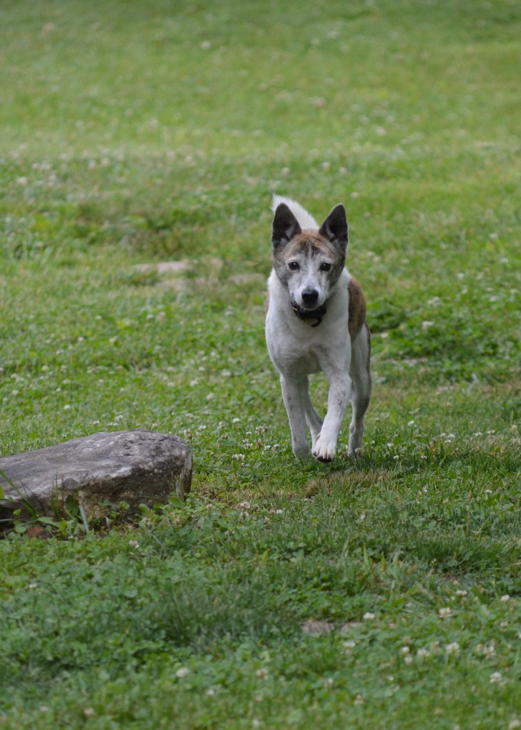 Meanwhile, our dogs are OK… Eddy is quite obsessed by coyotes. There are many around, as we can hear them at night singing in the woods. Eddy loves it when they come into the pastures.