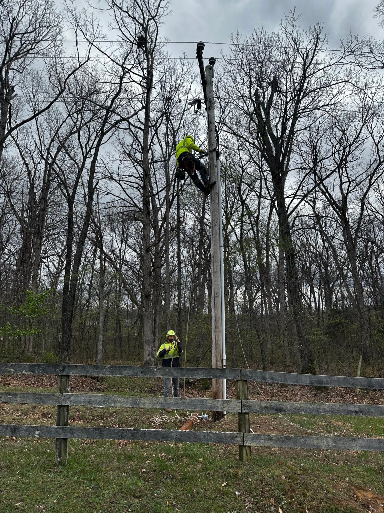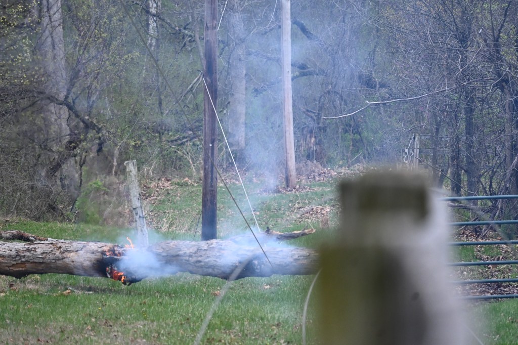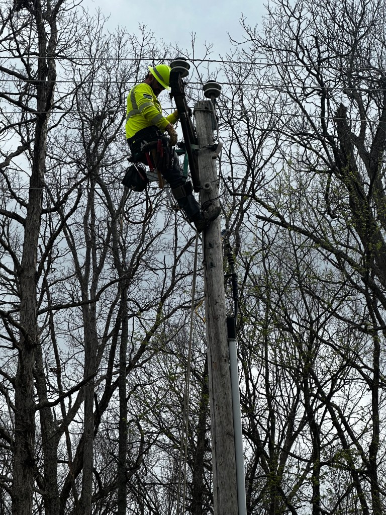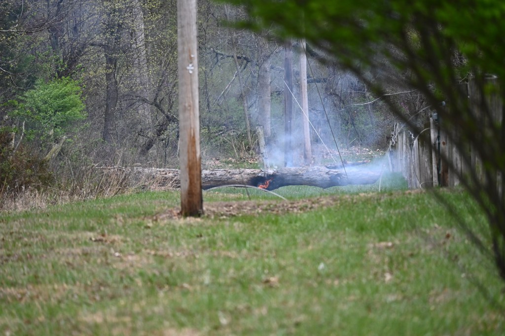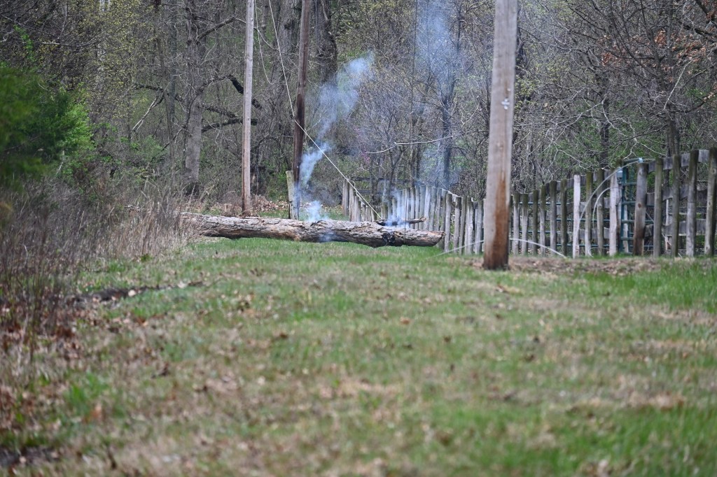 Tree down on lines and smoking. Where there’s smoke, there’s fire! Thank goodness for the rain!Yikes! The grass is on fire!Burning through the treeHelp on the wayJane’s herd is alarmed after a loud, explosive crackThe electric crew warned that the tree would break and the line would spring, throwing the treeAnd it threw the tree to the southNice that the way is now clear for workersA competent and cheerful crew on a cold Easter Saturday The work is underwayThey know what they are doingJane documents the dayJane took pictures of the worker up the pole – I had gone home to get warm!Another picture from Jane – brave men!
