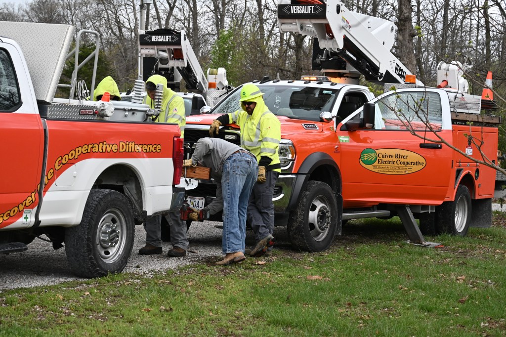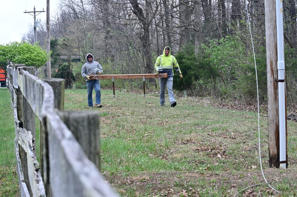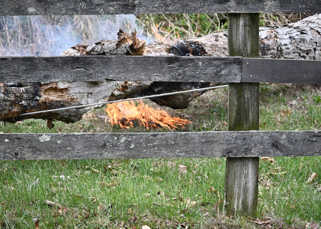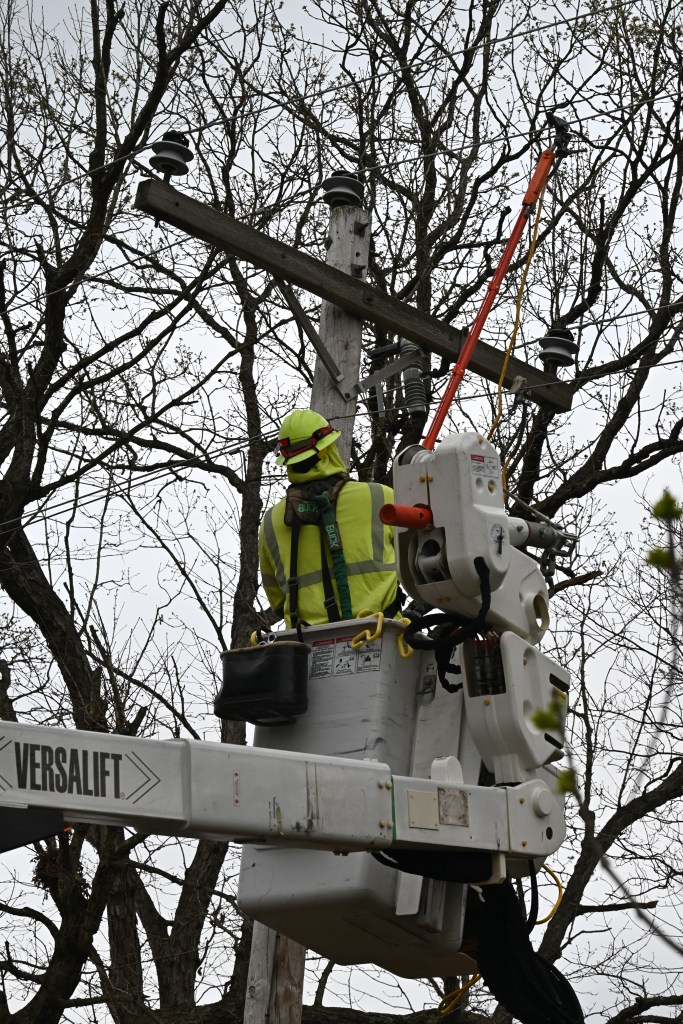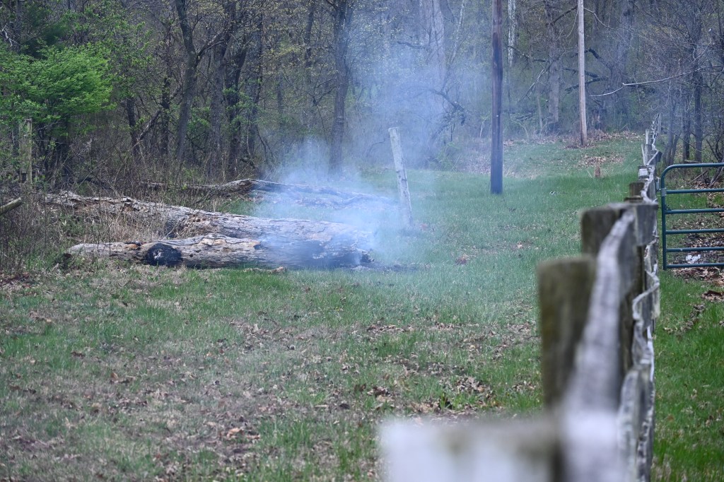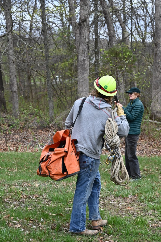 Tree down on lines and smoking. Where there’s smoke, there’s fire! Thank goodness for the rain!Yikes! The grass is on fire!Burning through the treeHelp on the wayJane’s herd is alarmed after a loud, explosive crackThe electric crew warned that the tree would break and the line would spring, throwing the treeAnd it threw the tree to the southNice that the way is now clear for workersA competent and cheerful crew on a cold Easter Saturday The work is underwayThey know what they are doingJane documents the dayJane took pictures of the worker up the pole – I had gone home to get warm!Another picture from Jane – brave men!