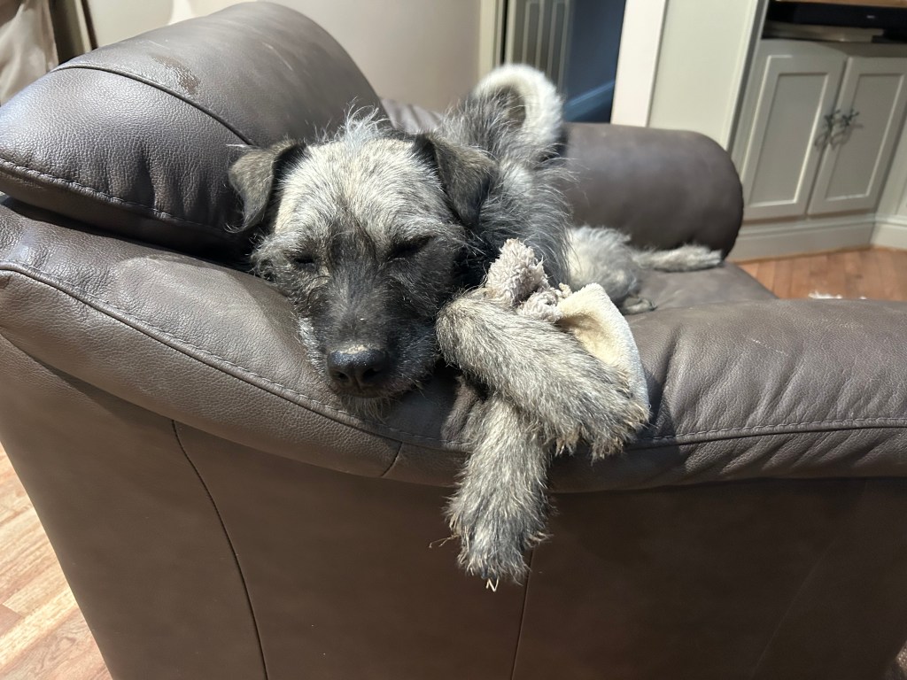 Ancient, little Skittle out and aboutTom Morris and Marmalade Skittle stretches as she wakes up on her dirty, but heated, bed