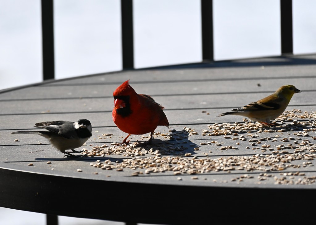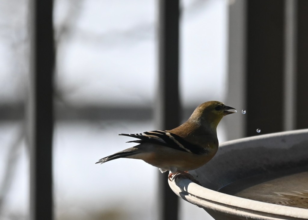 I did try to take some pictures of birds, and of Jane, when she came by with the mail. Not much to report today, though I am exhausted…