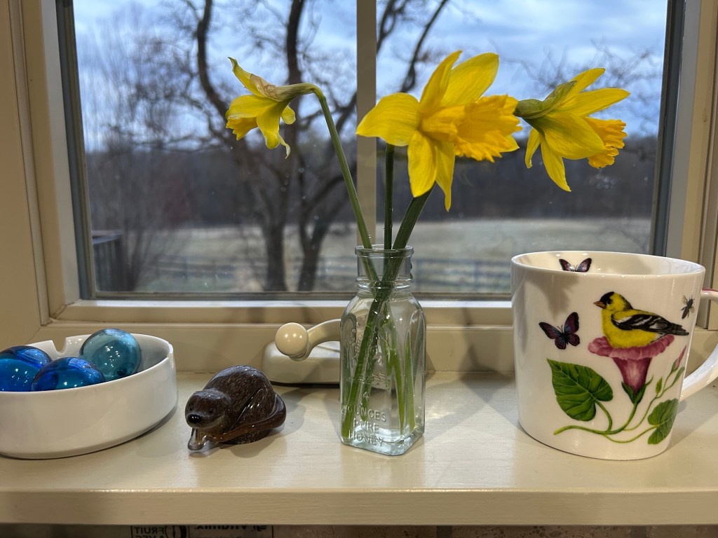 This cheers me up! Congratulations to Harry on his amazing recovery. It’s always nice to see the first flowers of Spring and daffodils look so happy. I love your goldfinch mug!