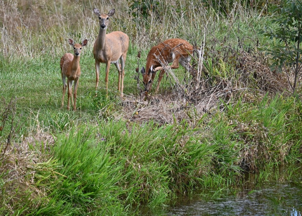 Then, before we left the gravel road, there was a doe with her growing fawns, on the edge of a pond.