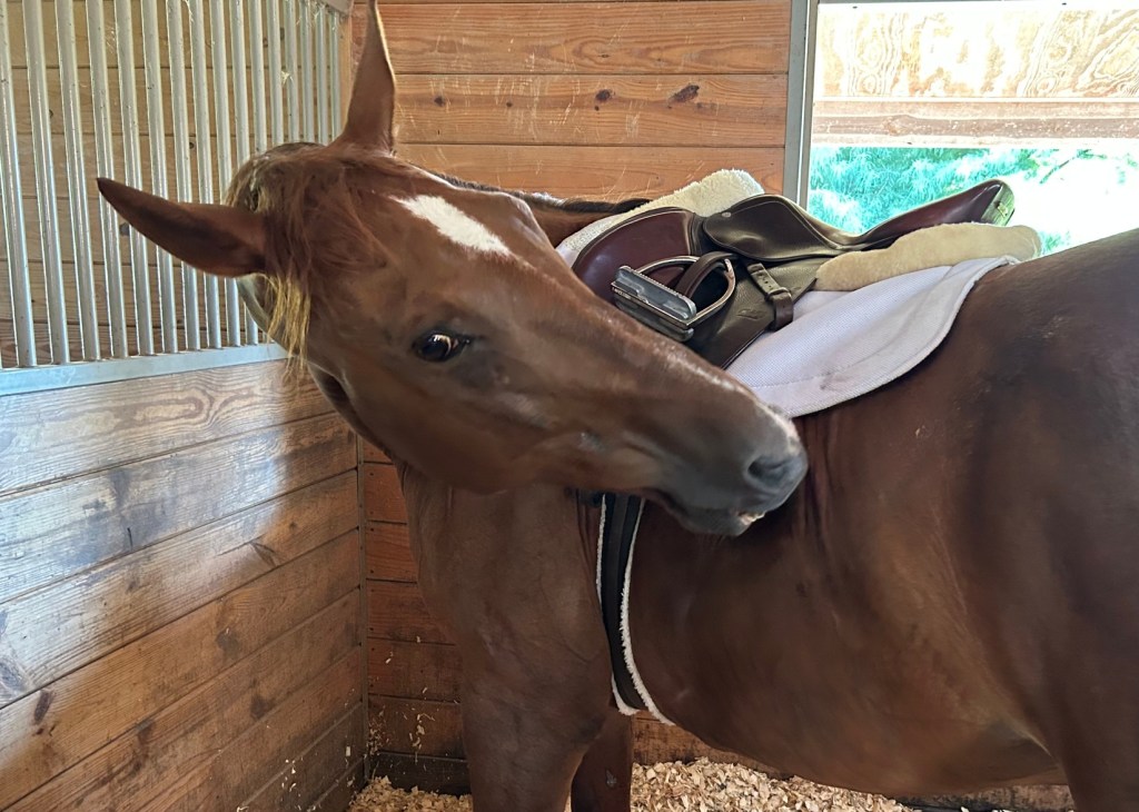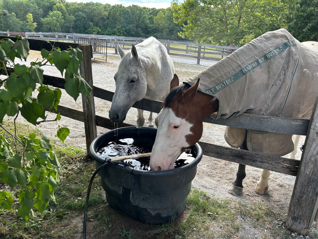 Back home, Bart furiously scratched an itch before I could even get his saddle off! After his bath, he and Oisin shared a scratch in the paddock. We had rain last night, at last, which brought cooler weather. That means Oisin can forego his fly sheet, which improves scratch sharing.