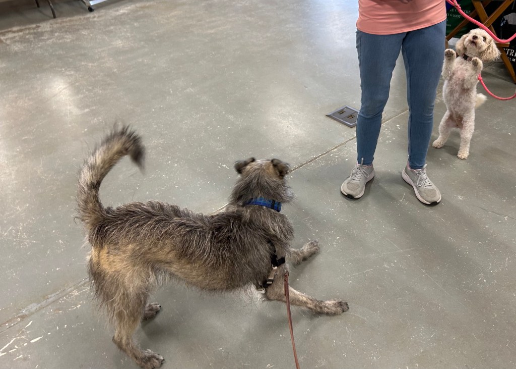 Eddy poses by the Kirin banner with Bart’s blue ribbonRibbonsEddy meets Peggy SueEddy and Peggy Sue, Maura’s dog, saved from a puppy mill operation