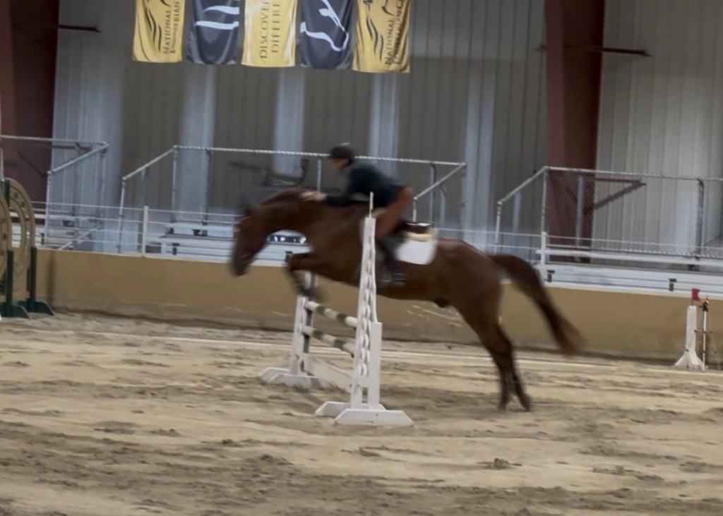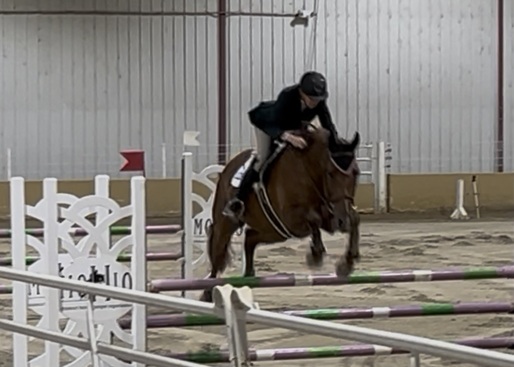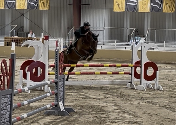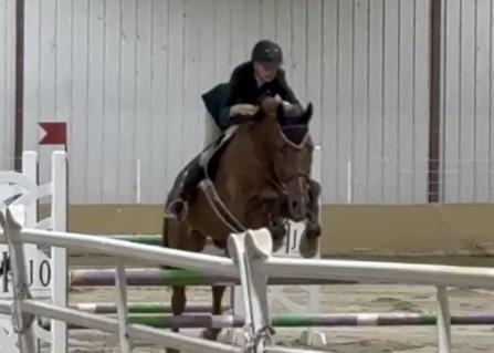 I passed my online Safe Sport qualification, which is necessary for rated shows, and I have reserved a stall for next week and the week after at the Pre Charity Show and the St. Louis National Charity Horse Show. I’m excited and quite nervous already. Jane helped me school Bart through a gymnastic on Wednesday. Unfortunately, she was going to swat a horse fly on Bart’s butt, and she tripped over a jump pole and fell on the dusty ring. Luckily, she was not hurt, but her phone camera got covered in dust, so the videos were hard to see, and the picture I took from the video is not very good…