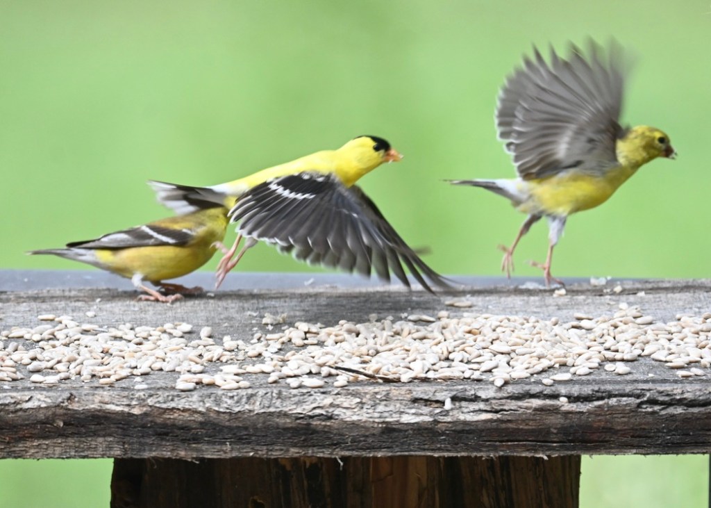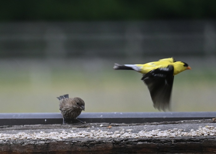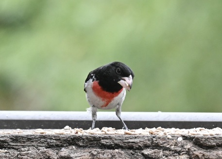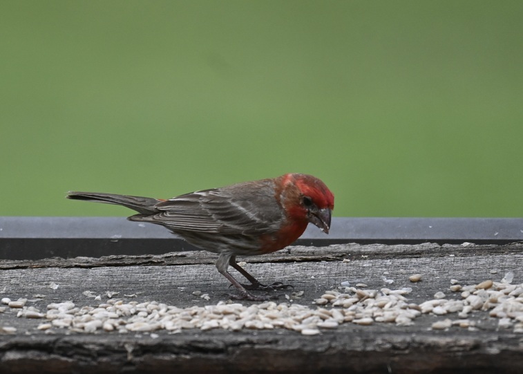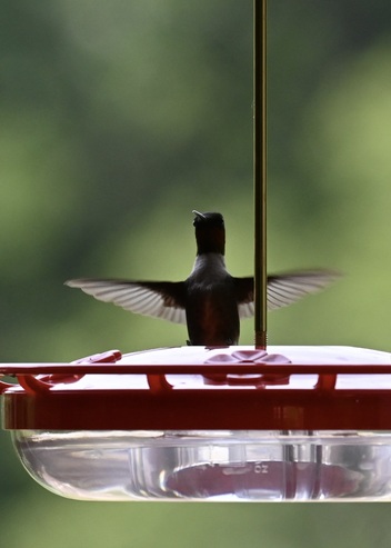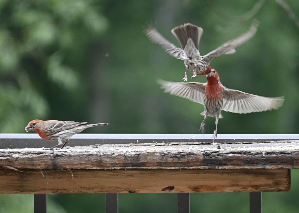A hummingbirdA tufted titmouseTufted titmouse coming in for a landingTufted titmouse in flightA blue jay Rose breasted grosbeak always wonders why I point that camera at him!A cardinal that seems to have met with some sort of accident (note the mouth)The cardinal seems quite recovered as he struts across the feed boardA female house finch and a male goldfinchBlue jayGoldfinches in flightA pair of lovey dovesHouse finches!Male house finchMany birds love suet!(Chickadee, downy woodpeckers and red bellied woodpecker)Red bellied woodpecker and red winged blackbird