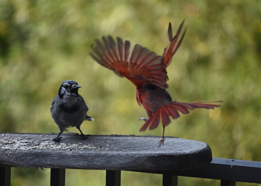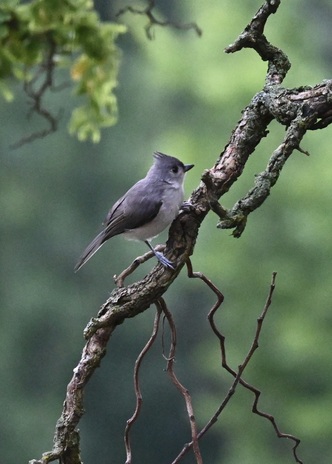 A tufted titmouse cooled off on this hot afternoon. A blue jay was caught in flight before he landed and cooled off by panting.