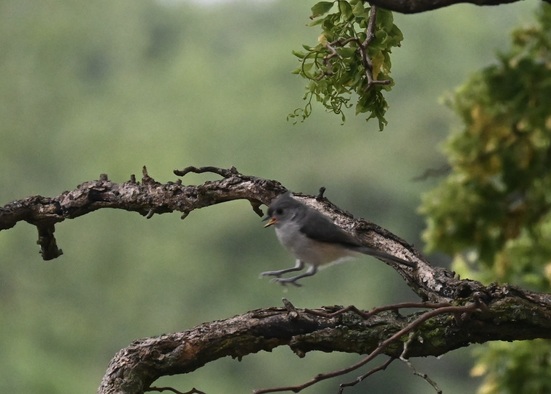 I was not sure what this bird was, on the suet with a red bellied woodpeckerResearch led me… to possibly an immature starling?Red bellied woodpecker and a young starling (perhaps)A tufted titmouse during a rain showerDamp, tiny tufted titmouseA less tiny, but no less damp, titmouseA titmouse with tuft plastered downAn eastern kingbird (Tyrannous tyrannous)Eastern kingbird in flightEvander Squirrel (so named for the bitten ear)A tanager on the suet, as a downy woodpecker flies pastSummer tanager in flight