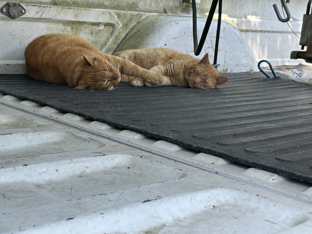 The boys at bedtimeMarmalade greets me every morningWeedy awaits a treatWeedy, Anne and Eddy (photo by Harry)Tom Morris and Marmalade nap in their favorite place in the truck bedJane