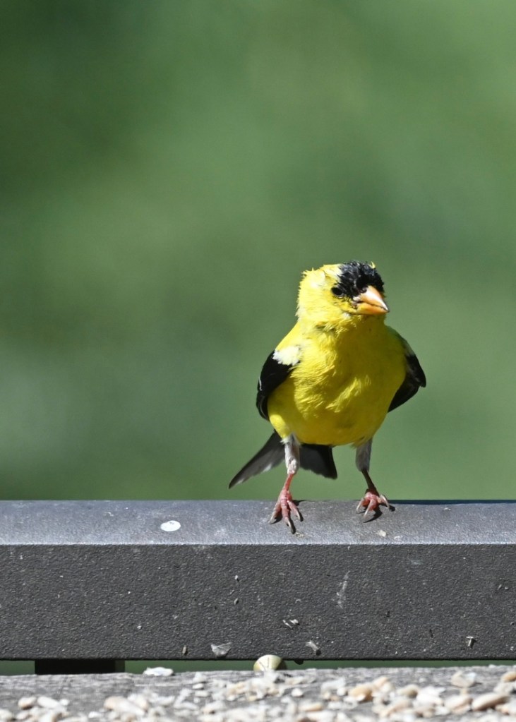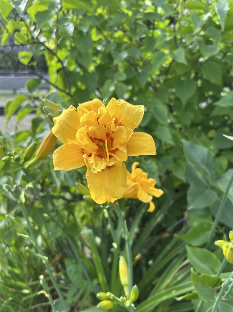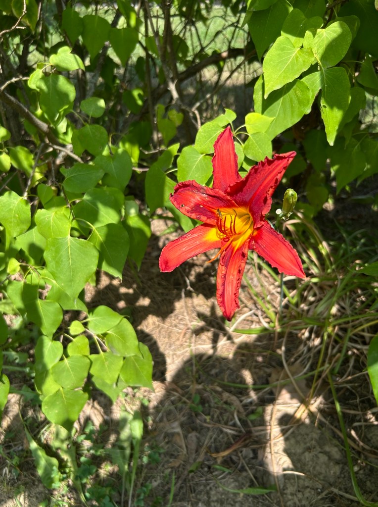 Bart’s very shaggy maneA more presentable maneOne beautiful day lily hidden in the lilac hedgeA glorious yellow lilyA new, pink perennial hibiscus, planted at a difficult time, but beautifulOne little goldfinch