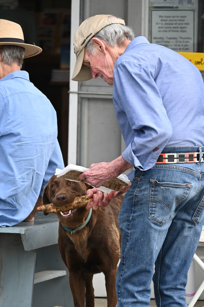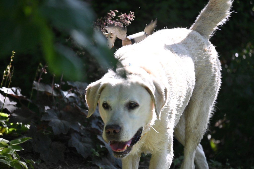 Wednesday evening, I saw Eddy with a Labrador. I assumed it was Roy, but it was not. He was an older and very hot dog, with two collars on, but no tags. We put him in the pen with water to keep him safe while we tried to find his owner. Without success around here, we resorted to calling the Warren County sheriff . Deputy Justin Wade came by and took a picture. At 9:00 PM, there was a knock on the front door, and the owners of Ruger, who, it turns out is 14 years old, arrived to pick him up. They had also thought to call the sheriff! Ruger had wandered off at 1 PM, so he had been gone for over four hours when he showed up here. A happy reunion and a good night’s sleep…