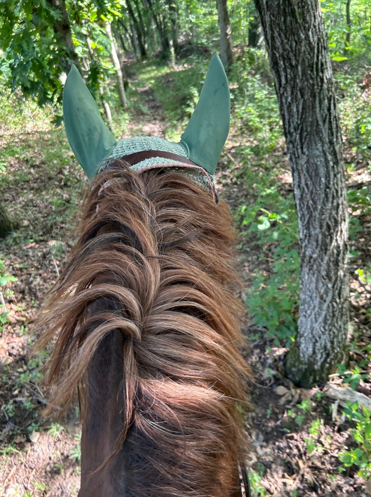 Bart is getting legged up and staying flexible by scratching itches. Every evening, he and Oisin share scratches, though poor Oisin wears a fly sheet for his sweet itch (an actual allergic medical condition), so his scratches from Bart are not as effective. The poor fly sheet is beginning to look like it’s been through a war. Meanwhile, Bart is also perfecting his escape tactics and runs off every other day as I am untacking.