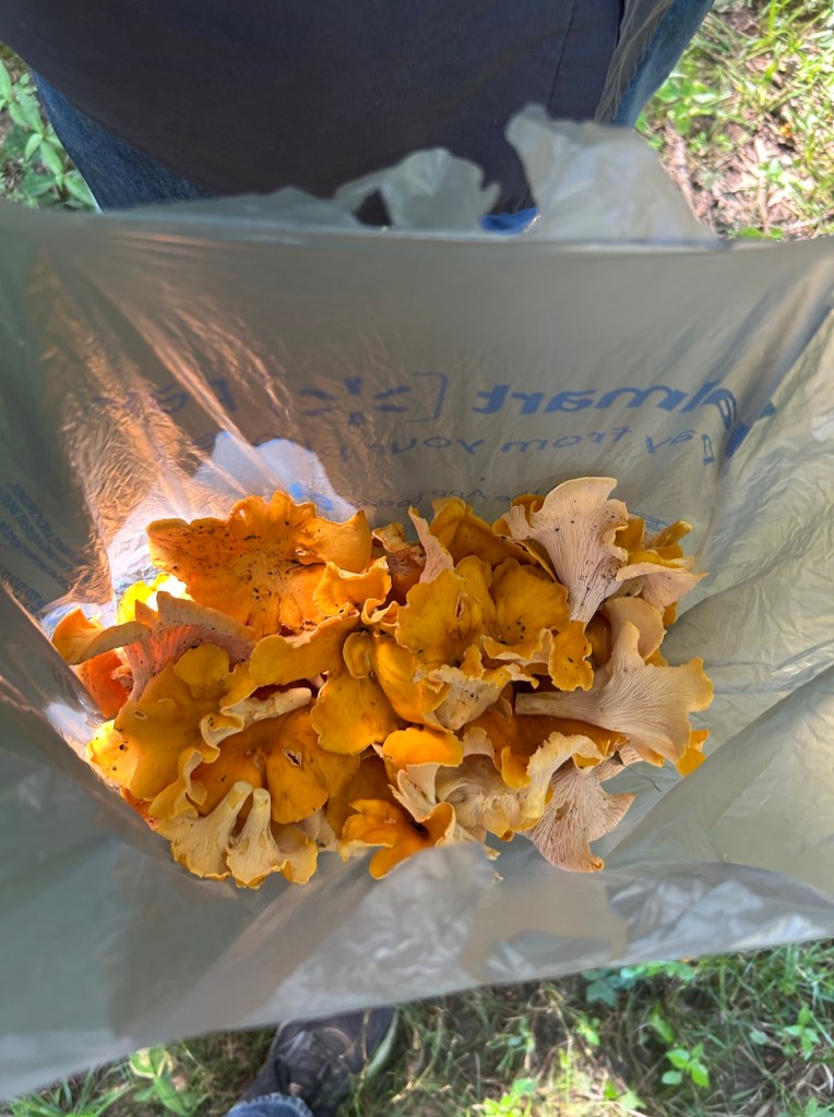The rain and the heat have produced a bumper crop of chanterelles. Nathan came out and I helped him harvest two bags. Alas, I got a terrible case of oak mites! I thought they arrived in August, so this was a nasty surprise.