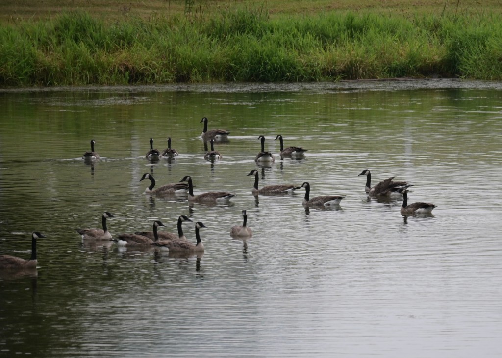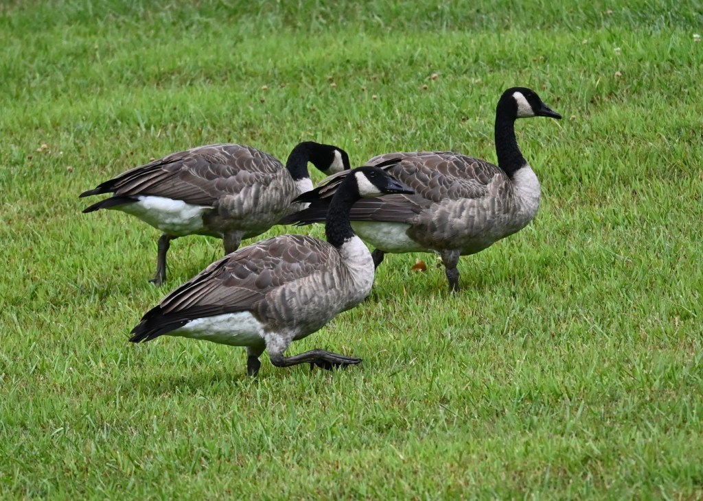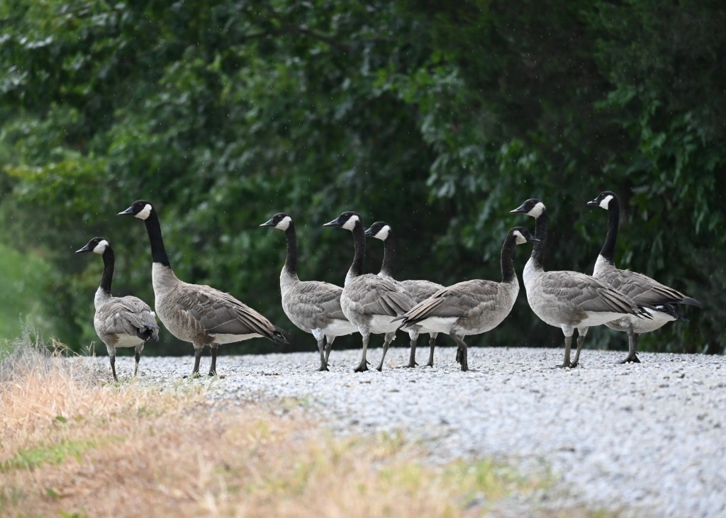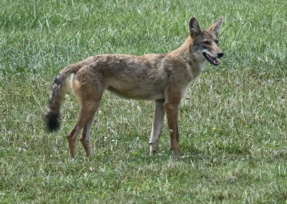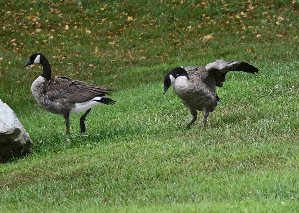 A cardinal challenges a blue jay!Geese in the roadMore geese in the waterGeese in the grass todayThree of a flock of 43 geese alongside the road this morningCoyote!