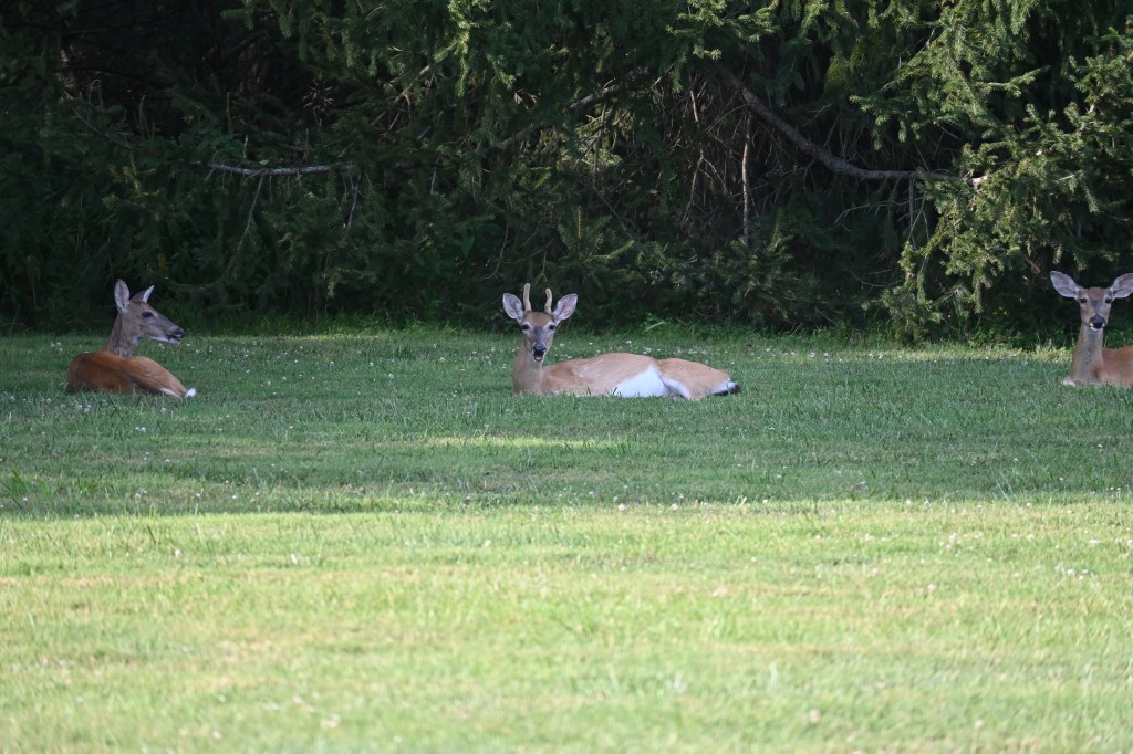 Many years ago, I lived down the road from Steve and Margaret. The area has changed, but it is very familiar countryside full of memories – and deer. I took a picture of a group of resting deer along the roadway. The road is under serious repair, so there is no traffic at all, which is nice.
