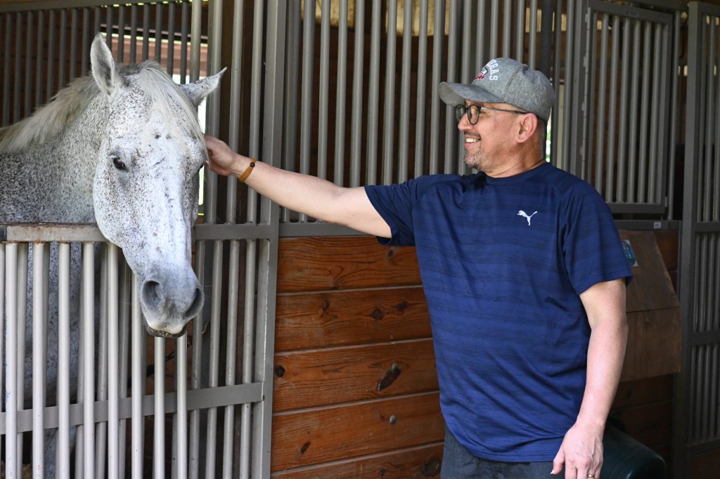 I had seen Kris at the horse shows and had watched him school a student. I liked his style of teaching, so I approached him and asked if he would “catch school” me , since I had stopped out on my new pinto. Also, would he please help Jane, too?