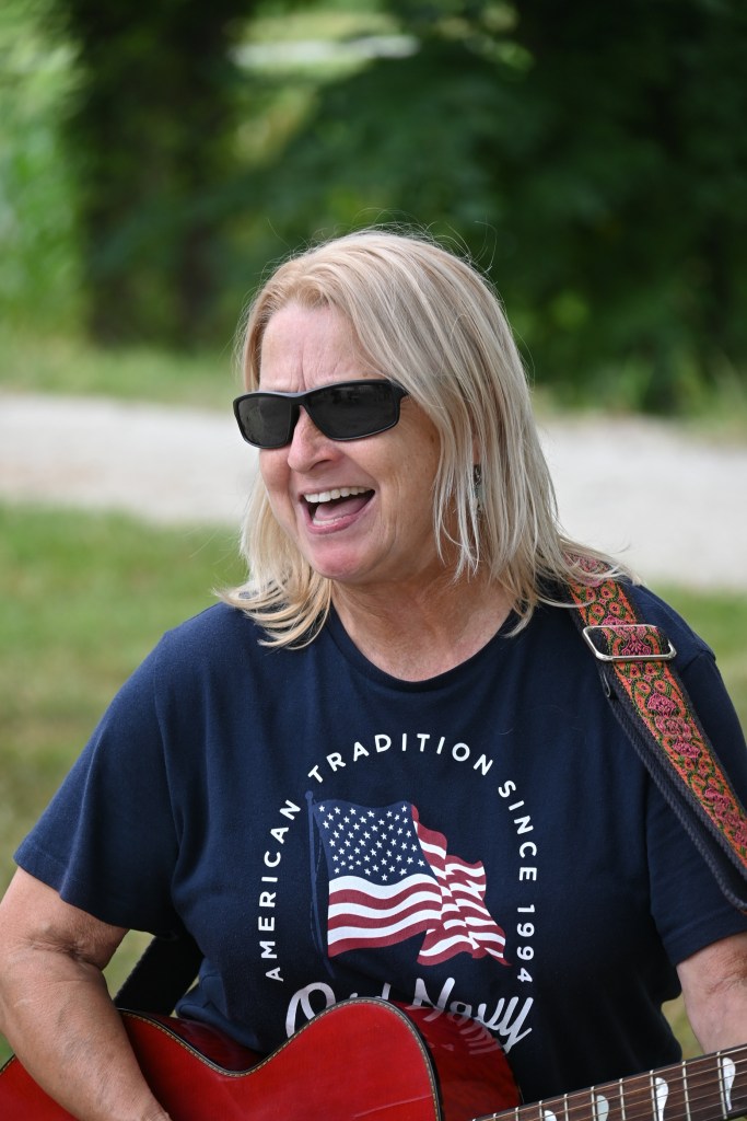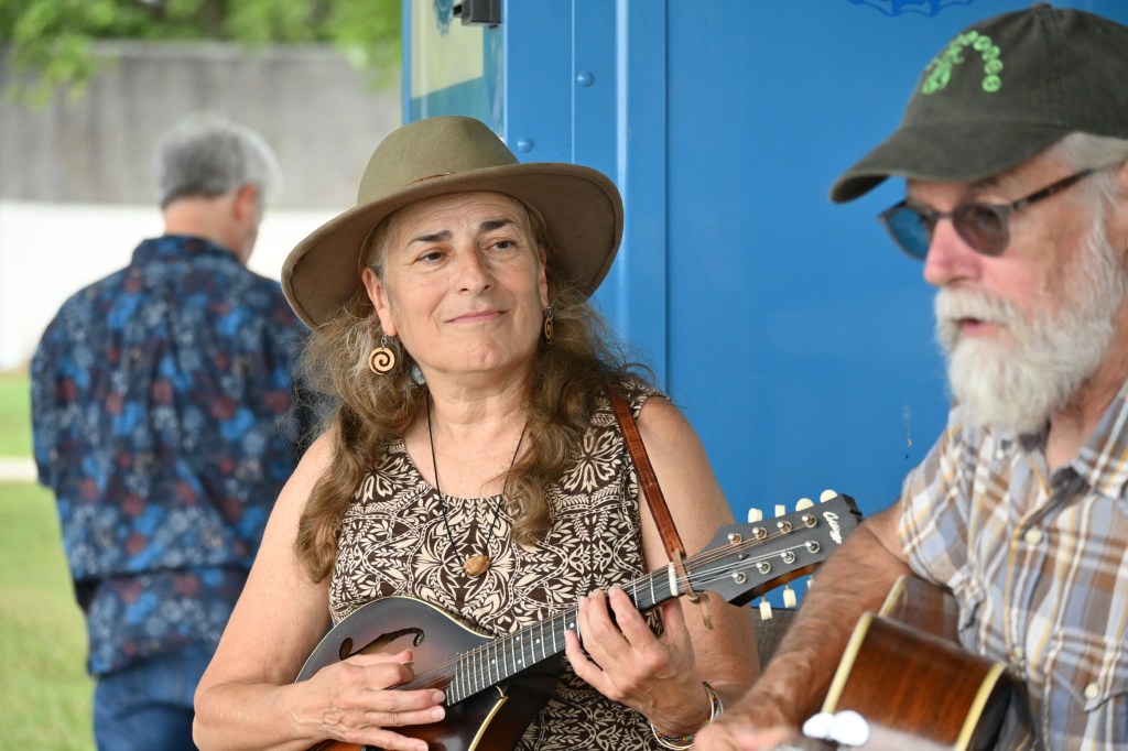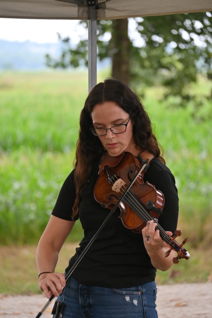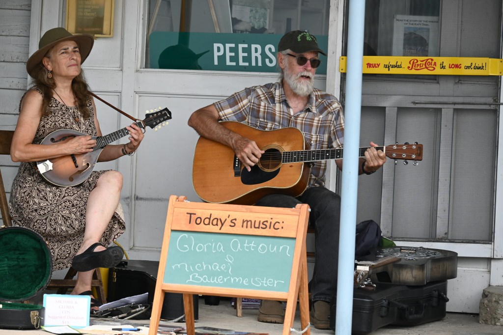 Sweet Corn sculpture in TreloarDan Burkhardt – with Bob Painter, who worked on the trains before rails became trailsConnie arrives at TreloarFree books for every family!Cindy Gladden,, a Warren County reporter covering the eventA participant, trying the sweet cornLive music by the Rowdy Wranglers next to the Katy TrailAn enthusiastic singer stands inFiddle playerHarmonica player