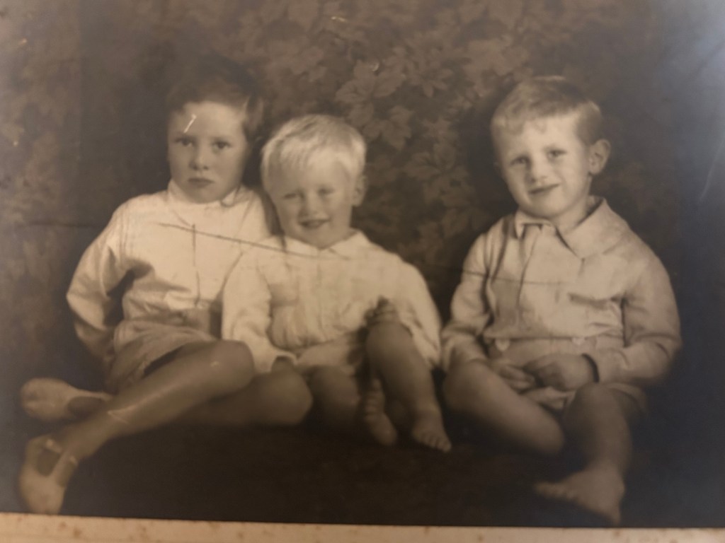 My grandfather was the only one of those three brothers to have children, and his three sons, Uncle Pete, Uncle Mike, and Brian, my father, all served in World War II and all survived. Uncle Pete was in Royal Naval Intelligence at Scapa Flow, Uncle Mike was in the RAF as a paratrooper, and was the first man to land on “A Bridge Too Far” at Arnhem. He was wounded, and taken prisoner by the Germans, but he came home to become a beloved country doctor. The youngest son, Brian, was an officer in the Royal Navy aboard HMS Orion at D-Day.